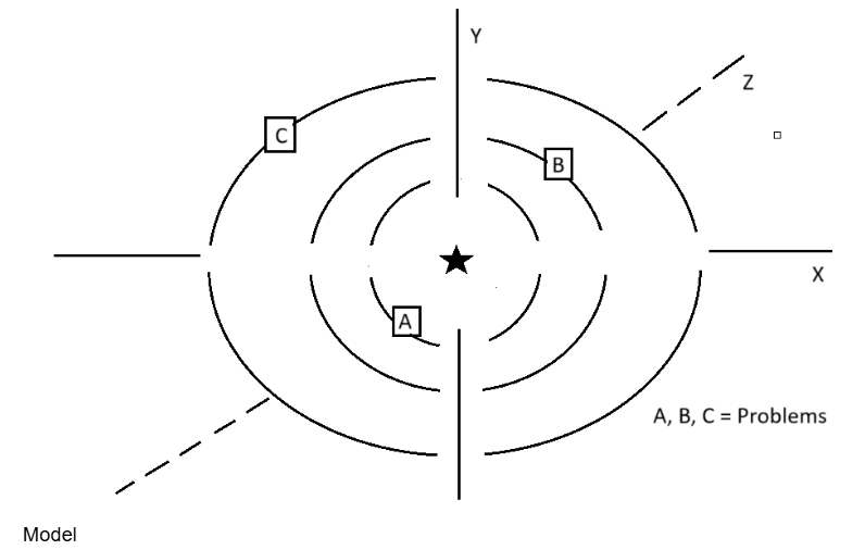 The gravitational pull of problems can be imagined across an x, y, and z plane, where our immediate attention and efforts are spent navigating the orbits of multiple challenges at once. We are the central star—like the sun—unmoving and unwavering, radiating the energy that holds our system together. The problems we focus on, our accelerations, do not orbit us neatly on a flat sheet; like real planets, they can tilt and wobble, moving above and below the plane on the z-axis as well as shifting along the x- and y-axes. Yet unlike the solar system, where the planets are fixed members of a long-standing family, the problems orbiting us are not permanent. They come and go, shifting in and out of existence, and sometimes even giving rise to new ones as old problems evolve. Just as the sun anchors the solar system, we too act as the center of gravity that pulls our problems into orbit, but the system is never static. Some problems demand our closest attention, circling tightly like Mercury, while others drift farther out like distant bodies with inclined paths. And when we find a solution, the problem does not always disappear—it may simply move outward, lingering on the edges of our orbit. In this way, our personal “sun” remains steady, constantly shaping, pulling, and balancing the problems that define the shifting system of our lives. See the model below.